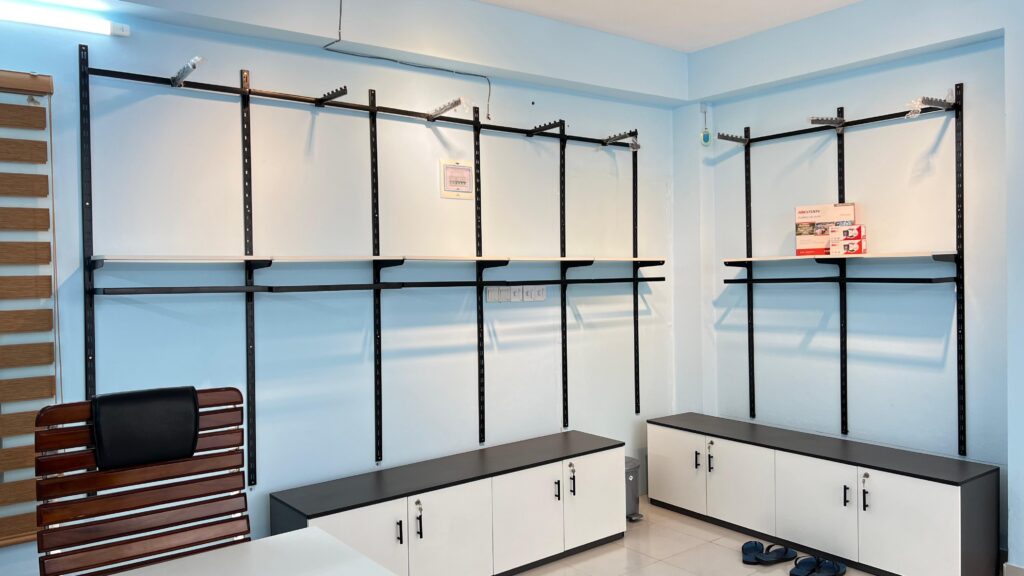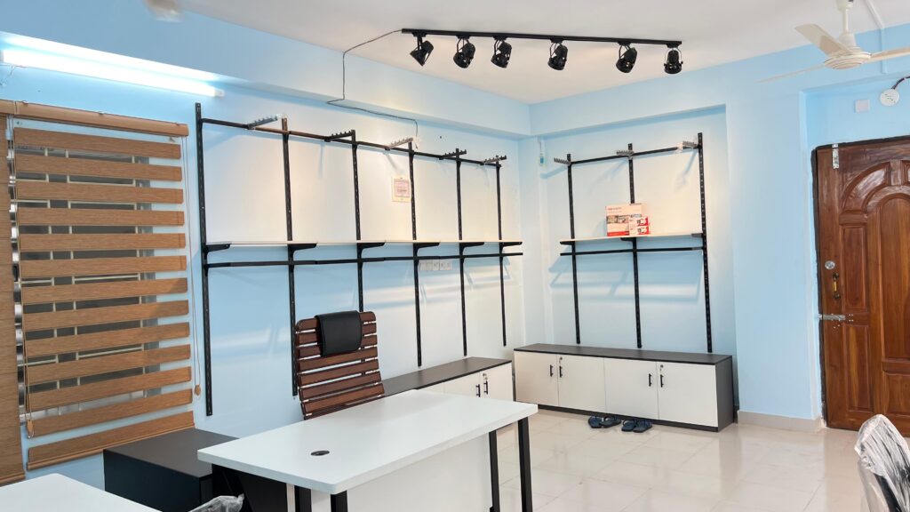 Professional product photography for garments and retail items, with physical shelf rental for product display and presentation.